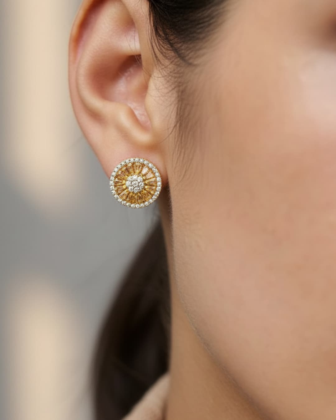 Os tons âmbar das zircônias trazem calor e sofisticação, criando um efeito dourado natural que valoriza o rosto. O tamanho pequeno permite uso diário confortável, sendo versátil para looks casuais e formais.