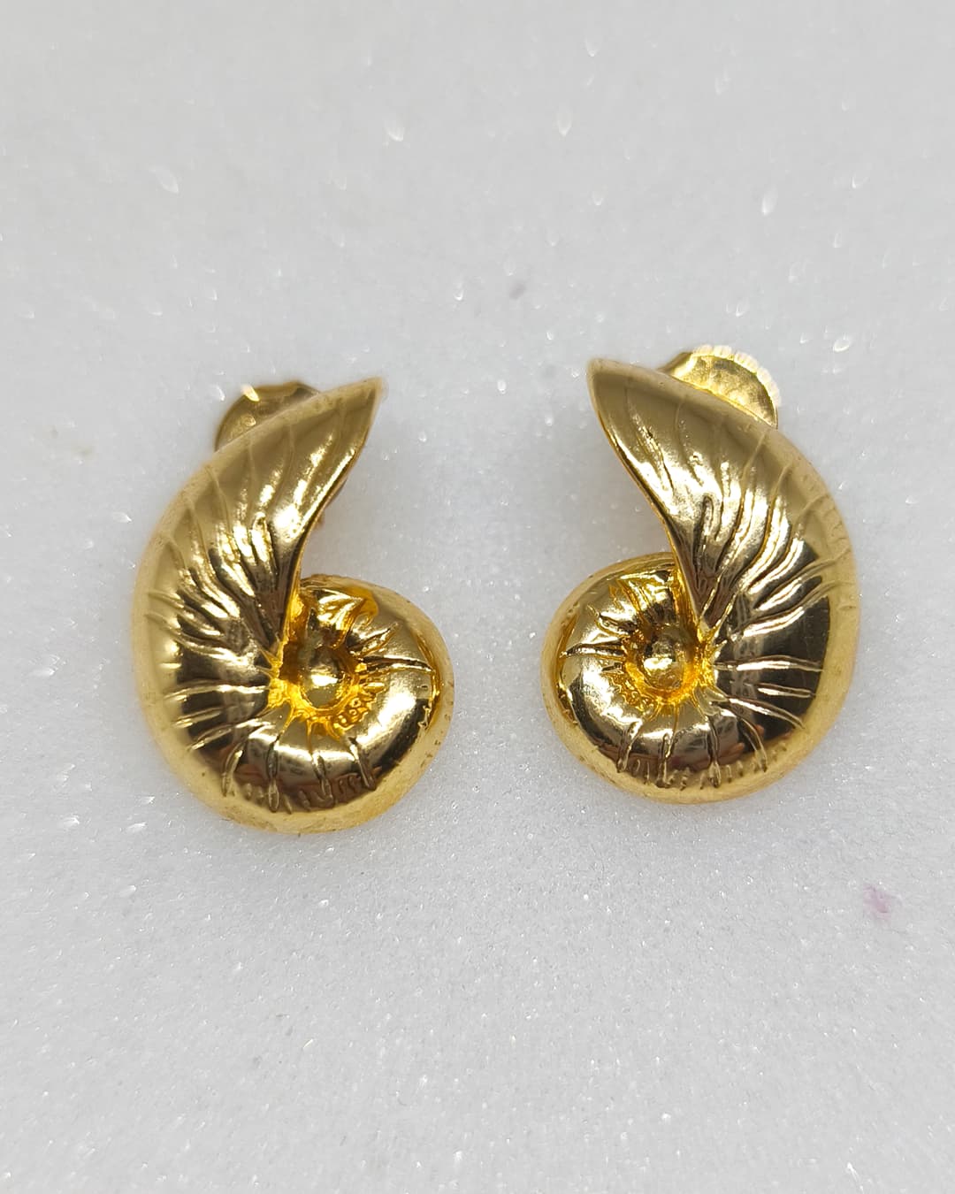Brincos semijoias formato concha caracol folheados a ouro com textura em relevo
