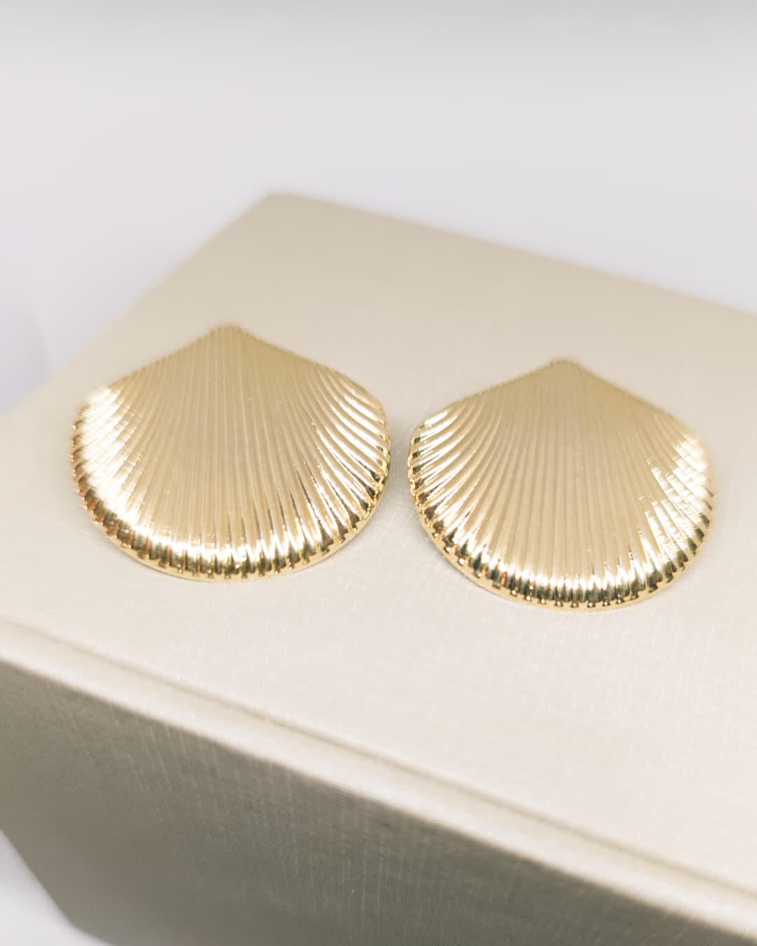 Elegância marinha atemporal! Estes sofisticados brincos reproduzem fielmente o formato clássico da concha vieira com suas características linhas caneladas radiantes. A textura em relevo cria um jogo de luz e sombra hipnotizante, enquanto o acabamento dourado confere luxo e refinamento ao design oceânico.