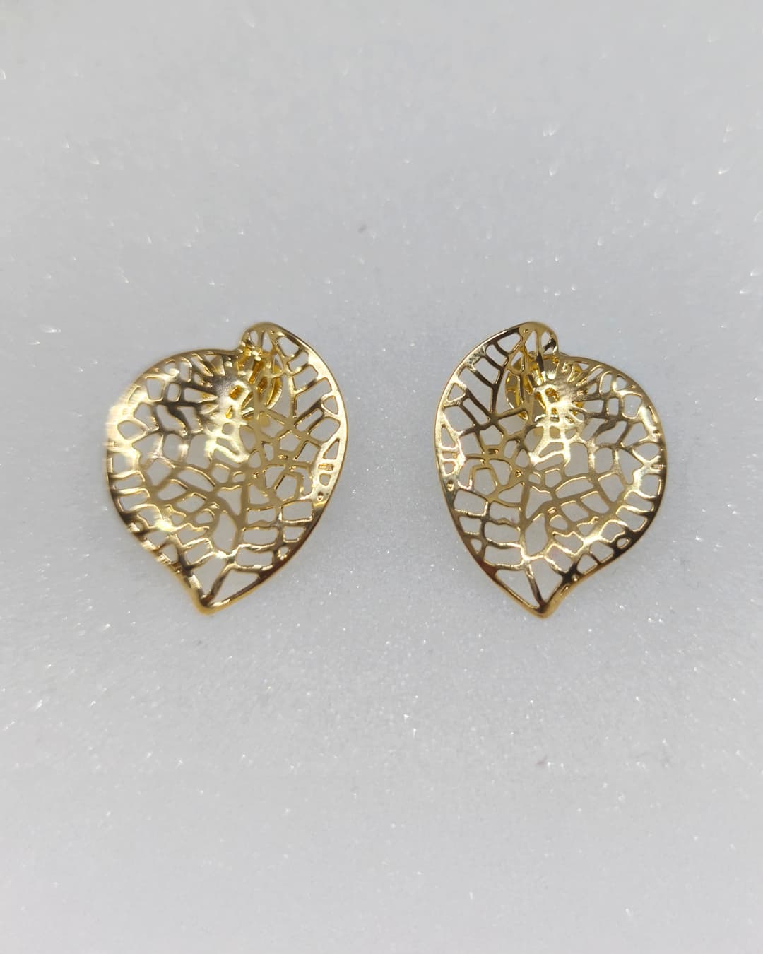 Brincos semijoias formato folha vazada folheados a ouro com textura filigrana