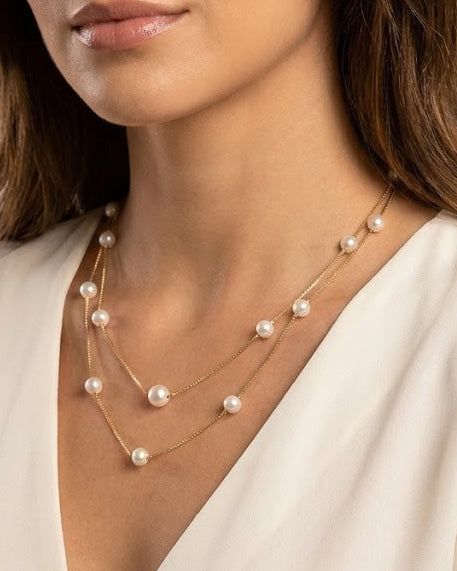 Colar semijoia dupla camada banhado a ouro com pérolas intercaladas flutuantes